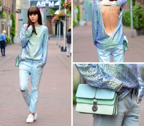 Tín đồ thời trang Lucy de Boer cá tính trong mẫu áo sequin khoe lưng kèm theo quần denim và phụ kiện ăn ý.