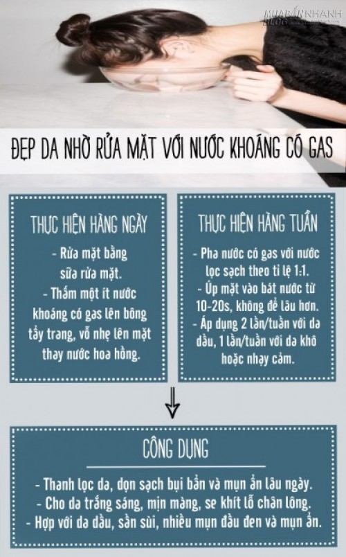 Sử dụng nước khoáng có gas để làm sạch sâu da mặt đang là xu hướng phái đẹp nói chung và sao Hàn nói riêng “lăng xê”. Đây là biện pháp rửa mặt giúp lọc lỗ chân lông hiệu quả, cho làn da trắng sáng, mịn màng, se lỗ chân lông trông thấy sau 2-3 tuần – đặc biệt thích hợp cho người sống ở môi trường ô nhiễm như thành thị, hay phải thức khuya và tiếp xúc với máy tính liên tục.