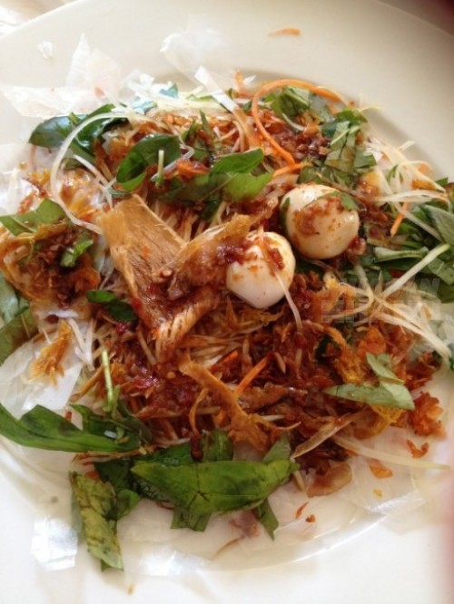 - Cho bánh tráng, xoài, khô bò, ruốc thịt heo, hành phi, mỡ hành và sa tế vào bát. Tiếp tục cho ít muối và nước tắc vào, dùng bao tay trộn đều lên. Cuối cùng cho rau răm, đậu phộng rang vào trộn thêm một lần nữa rồi cho trứng cút lên.