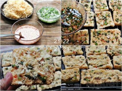 Mọi người cứ phết mắm đường lên trước, tiếp đến là mỡ hành rồi đến chà bông. Cứ thế là xong rồi nhé.