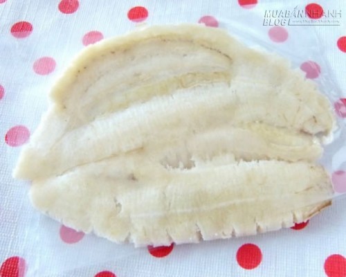 Sau đó dùng thớt nhỏ ép dẹp quả chuối ra này. Ép đều để chuối dẹp đều bạn nhé!