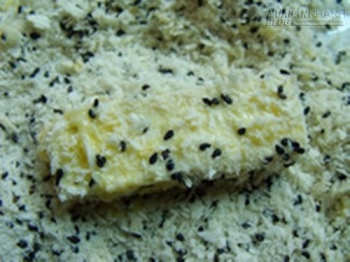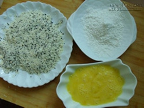 Bước 3: Lăn đậu qua bột mì, sau đó nhúng vào trứng và cuối cùng là vụn bánh mì cùng hạt mè