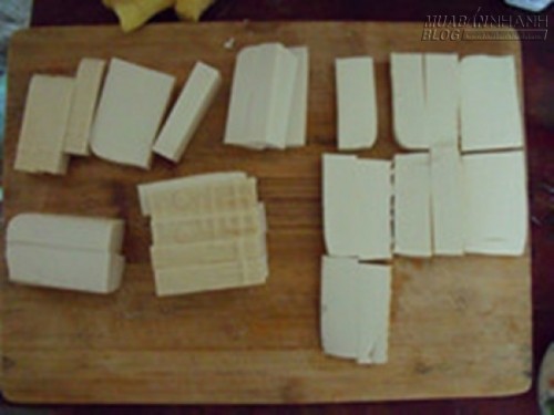 Bước 2: Đậu hũ cắt nhỏ thành thanh, chú ý tránh để bị nát