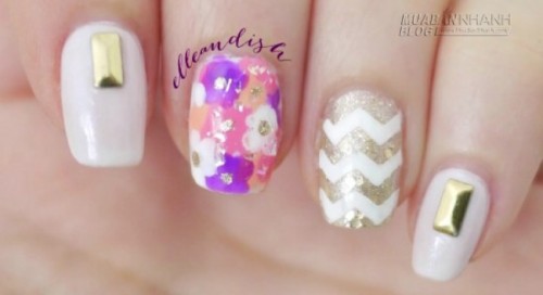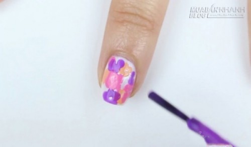 Với nail thứ 2, dùng các màu sắc yêu thích như vàng cam, hồng, tím... để vẽ những bông hoa lên khắp nail.