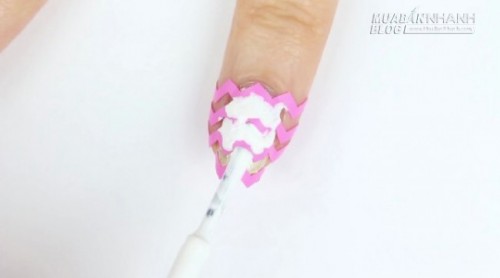 Dán lên nail các mẩu giấy cắt hình zic zắc để làm khuôn, sau đó dùng sơn màu trắng vẽ lên các vùng hở của nail.