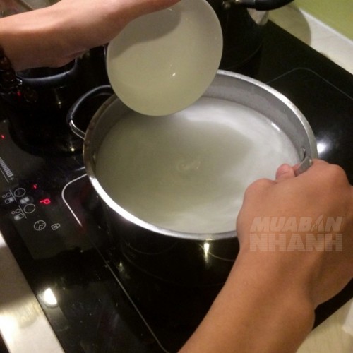 Đổ nước dừa vào nồi và nấu cho nóng trước. 1 gói bột rau câu thường nấu được khoảng 3 lít nước như trong hướng dẫn nhưng mình nghĩ 2 lít là ngon nhất.