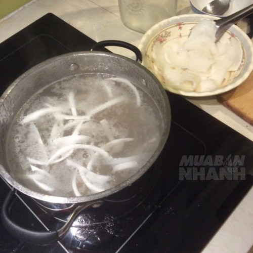 Khi cảm thấy nước đã hơi sôi, một tay khuấy nồi nước, 1 tay cho dần chén hỗn hợp đường + bột rau câu vào.