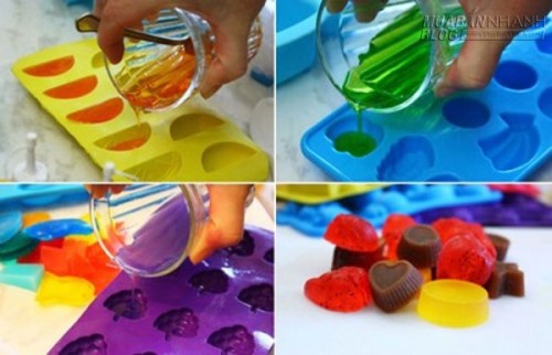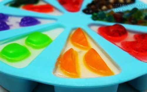 4.Trang trí bánh kem: Pha màu xà bông và đổ vào các khuôn hình trái cây, màu cam cho tép cam, màu tím cho chùm nho, màu xanh cho quả táo, màu đỏ cho quả dâu, màu nâu cho bánh chocolate… để khô và lấy xà bông ra khỏi khuôn.