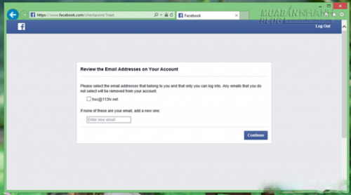 Tiếp theo, Facebook sẽ yêu cầu bạn xác nhận lại thông tin địa chỉ email của tài khoản. Nếu địa chỉ email của tài khoản không phải của bạn, hãy nhập địa chỉ mới ở khung trống phía dưới. Trường hợp địa chỉ email không có vấn đề gì, hãy đánh dấu vào nó và nhấp Continue.