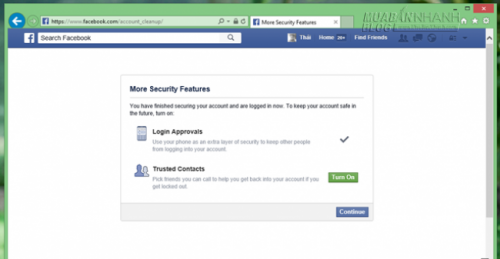 Khi mật khẩu được xác thực thành công, bạn sẽ được Facebook giới thiệu một số cách để bảo mật cho tài khoản, theo đó bạn có thể nhanh chóng lấy lại tài khoản khi bị đánh cắp. Ở đây, hãy nhấn Continue (Tiếp tục).