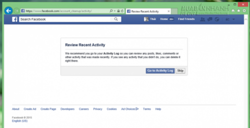 Cuối cùng, bạn sẽ được đưa đến trang gợi ý kiểm tra lại nhật ký hoạt động của tài khoản, bạn hãy nhấp vào Go to Activity Log (Truy cập nhật ký hoạt động) để tiến hành rà soát lại hoạt động của tài khoản để xem những hành động mà hacker sử dụng tài khoản Facebook của bạn. Nếu bạn không quan tâm, hãy nhấp Skip để bỏ qua.