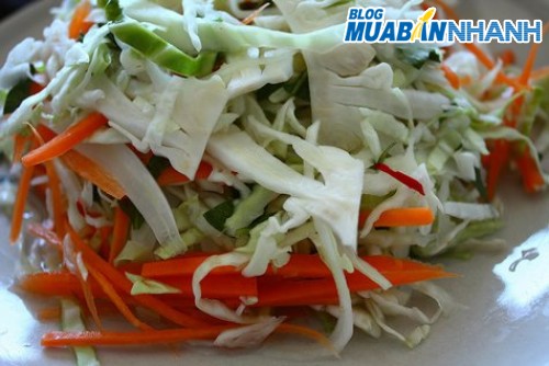 Bắp cải đem thái nhỏ, cần và hành lá cắt khúc, phần củ có thể chẻ nhỏ, cà rốt thái sợi, rau răm xắt khoảng 1cm, hành khô giã dập. Trộn đều các loại rau.