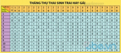 Theo bảng này, bạn xem cột tuổi của người mẹ phía trên từ 18 đến hết 40. Cột dọc bên trái ứng với tháng thụ thai. Nếu rơi vào ô có dấu “+” là sinh con trai, dấu “0” là sinh con gái.