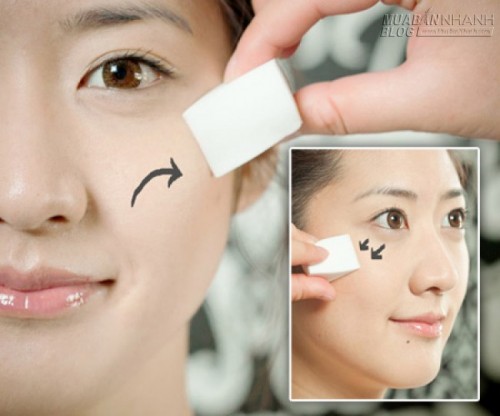 Dùng loại nền quen thuộc nhất, chấm lên 5 điểm: trán, mũi, cằm và hai bên gò má, dùng mút trang điểm hoặc cọ để tán ra thật đều và thật mỏng, phủ nền lên cả môi. Phủ lại phấn để có lớp nền khô thoáng và lâu trôi hơn.