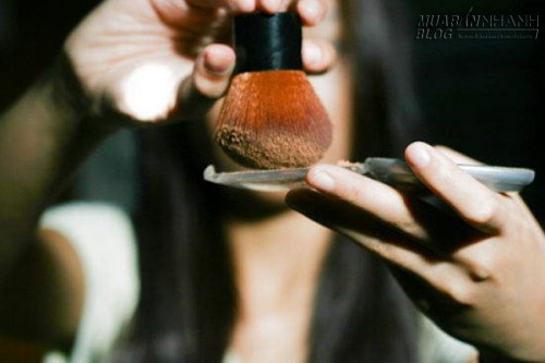 Các bạn dùng chổi trang điểm để tán đều phấn phủ cho khuôn mặt của bạn.