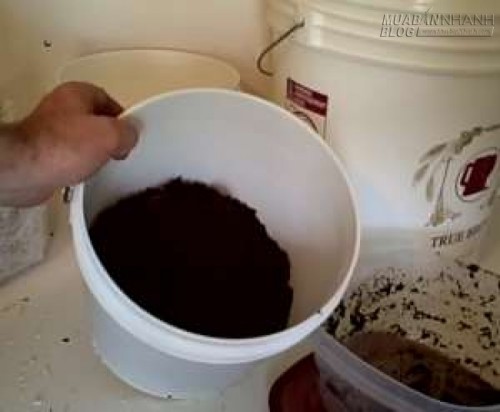 - Đổ bã cà phê đầy khoảng 1/2 thùng nhựa.