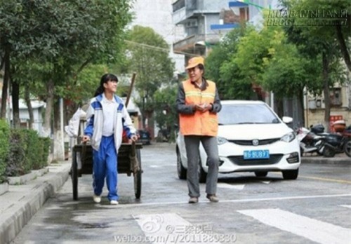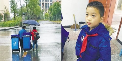 Ngày hôm qua, bức ảnh về một cậu bé 7 tuổi chủ động che ô, kéo rác cho một người phụ nữ lao công dưới trời mưa to được đăng tải trên mạng Weibo, trên trang báo Sina khiến nhiều người cảm động. Bức ảnh được đăng tải với dòng chú thích "Dưới trời mưa to như trút, một cậu bé 7 tuổi chủ động che ô, kéo rác cho người lao công. Thật đáng ngưỡng mộ".