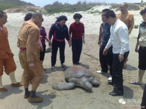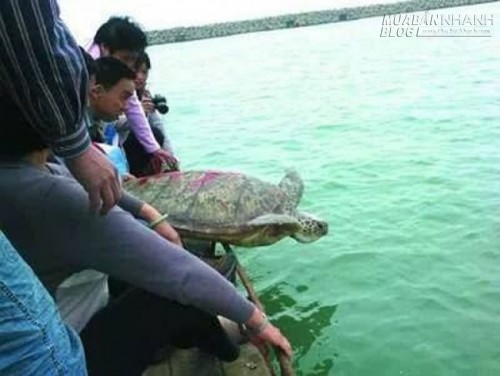 Trước khi thả con rùa về biển ông Lâm đã viết lên lưng nó dòng chữ: “Ngộ Duyên Hiệu phóng sinh”. Ảnh: Internet