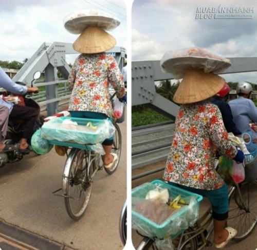 Vừa đạp xe đạp, vừa đội nón, còn đội thêm một mẹt bánh trên đầu, thế mà vẫn đi được. Không phải ai cũng có thể làm được những điều kì diệu thế này, cô quá giỏi luôn phải không mọi người?
