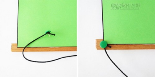 | Bước 5: - Cắt 1 đoạn dây, buộc vào hai chiếc đinh và đóng cố định hai chiếc đinh vào hai đầu của một thanh gỗ làm móc treo. Mách nhỏ: Thay vì đóng đinh, bạn có thể buộc trực tiếp sợi dây vào đầu thanh gỗ cũng được nhé! |