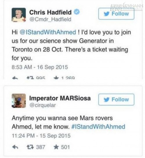 Đã có hàng nghìn bài đăng trên Twitter hay Facebook, lên án những kẻ đã còng tay Ahmed và dập tắt đi sự ngây thơ của em. Hàng trăm nghìn người sẵn sàng đứng lên bảo vệ Ahmed khỏi những thành kiến và những kỳ thị chủng tộc. Trong số đó, có cả những thủ lĩnh, những con chim đầu đàn của cộng đồng đã dang đôi cánh ôm lấy Ahmed, để một lần nữa thổi lên trong em tình yêu khoa học và sự sáng tạo.