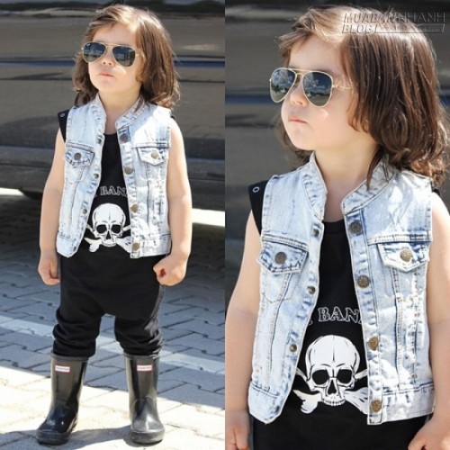 Ngôi sao thời trang nhí "ngầu" với jumpsuit hình họa đầu lâu, gile denim và bốt cao cổ.