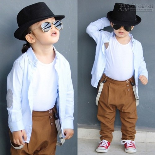 Nhóc tỳ siêu dễ thương khi diện áo ba lỗ, mix quần baggy, sơ mi khoác ngoài, bổ sung kính râm và mũ phớt xì-tai.