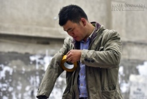 Tay anh Chung bị thương phải dán cao thuốc do mấy ngày trước vận chuyển đồ nặng