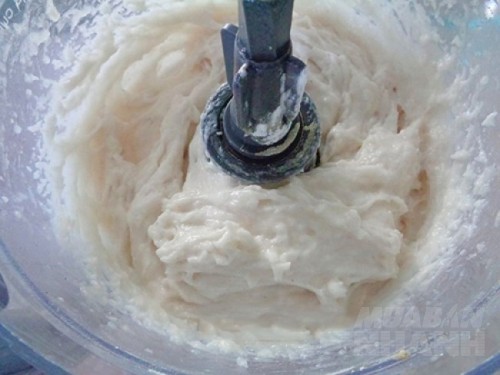 Sau đó cho vào máy xay cùng với tất cả các nguyên liệu, gia vị phía trên. Xay 2 phút thì ta có giò cá nhuyễn dẻo rất ngon. Tắt máy.