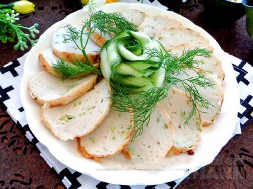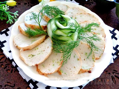 Chả cá cắt khoanh xếp ra đĩa, chính giữa để hoa hồng dưa leo và vài cọng thì là cho đẹp.