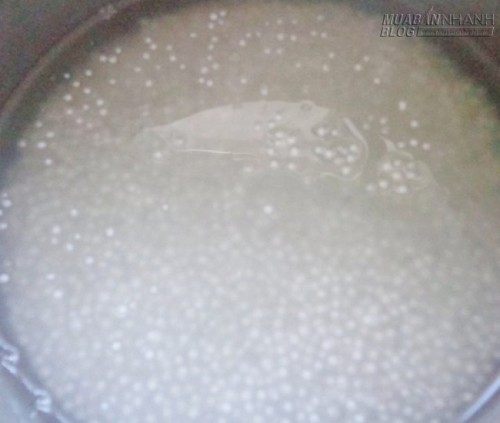 Bước 2: Bây giờ cho 600ml nước vào nồi bột báng, bắc lên bếp nấu, khi thấy bột báng trong thì cho đường vào nấu 10 phút. Cuối cùng cho nước cốt dừa vào đảo đều, nêm chút muối và nếm thử xem có vừa ngọt chưa thì tắt bếp.