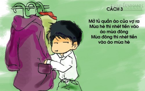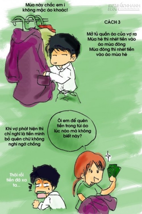 Nếu để tiền trong túi áo của mình, khi vợ phát hiện là có chuyện ngay. Thế nên các ông chồng chọn cách nhét tiền vào áo khoác của vợ. Nhưng điều này cũng đồng nghĩa với việc nếu vợ tình cờ tìm được thì "tiền như lá bay xa" luôn.