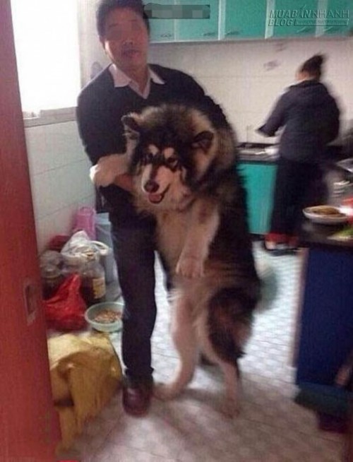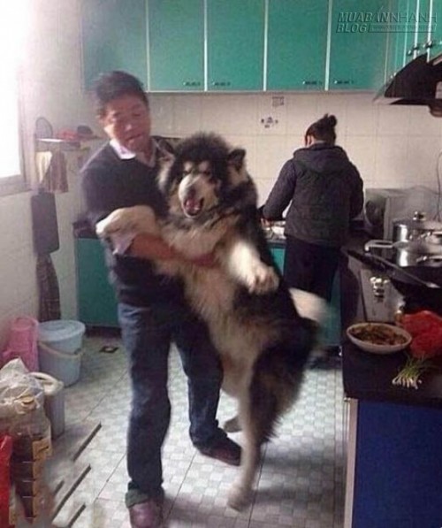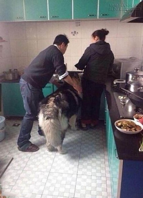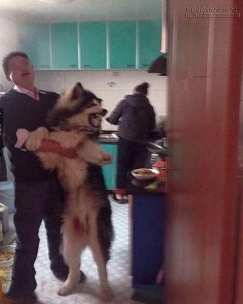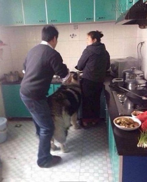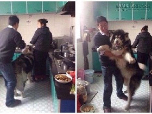 Thông tin trên hình ảnh cho thấy, chú chó cưng Husky đã lẻn vào bếp rình ăn vụng vì không cưỡng nổi mùi thơm từ bếp phát ra. Mặc dù bà chủ đang đứng cạnh nhưng chú chó này vẫn dũng cảm nhấc chân lên thành bếp để ăn vụng. Ông chủ nhà đã xuất hiện và đưa chú chó to xác ra ngoài, dù vậy nhưng Husky vẫn phản ứng dữ dội như thể mình là người oan ức.