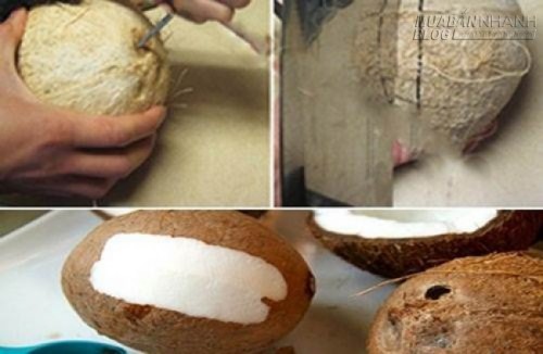 - Đục dừa lấy nước cho vào bát, rồi hơ qua lửa làm nóng để dễ tách được phần cùi dừa.