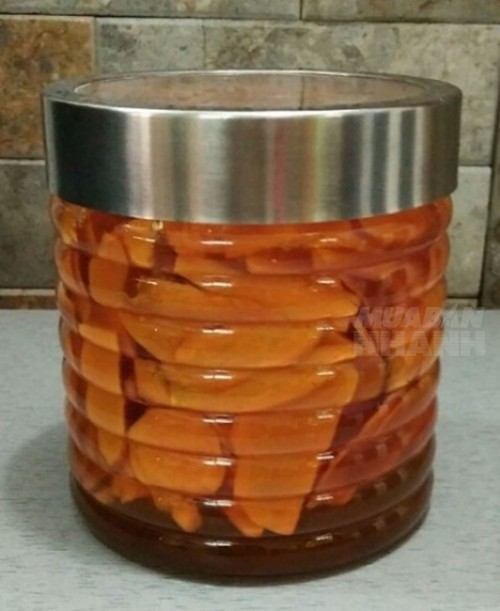 - Hoàn thành xong, bạn xếp nghệ vào bình, rồi đổ hết 1 lít mật ong nguyên chất đã chuẩn bị trước đó.