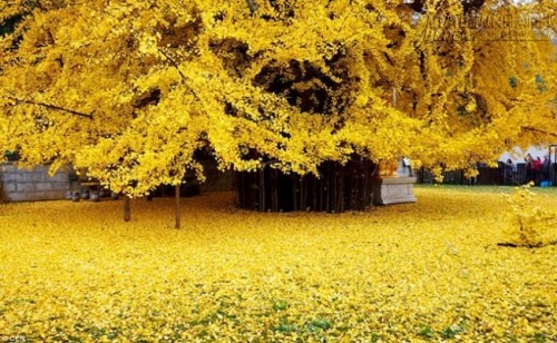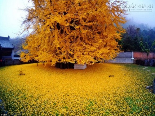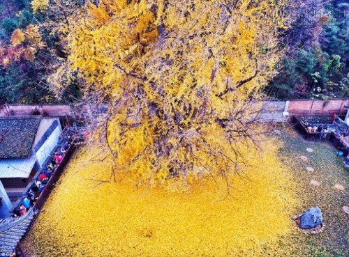 Hình ảnh của cây ginkgo 1400 tuổi tại một ngôi đền tại thành phố Tây Anh, tỉnh Thiểm Tây, Trung Quốc đang khiến rất nhiều khách du lịch tò mò không quản đường xa để tới ghé thăm, chiêm ngưỡng vẻ đẹp đầy choáng ngợp của nó. Theo những thông tin của người trông coi đền, nó được trồng vào thời nhà Đường (618- 907), vào mùa thu, cây ginkgo rải một tấm thảm bằng lá vàng rực rỡ phủ khắp sân.