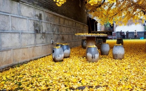 Cây bạch quả phủ làng vàng khắp sân đền.