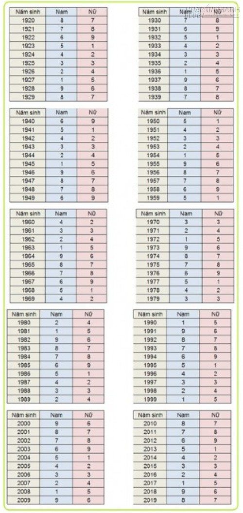 Sau đây là các thông tin cần thiết để tìm hướng tốt xấu của mỗi người theo năm sinh.