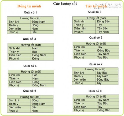 Mỗi người đều có 4 hướng tốt nên chọn (Sinh Khí, Thiên Y, Diên Niên và Phục Vị, trong đó Sinh Khí được coi là hướng tốt nhất) và 4 hướng xấu nên tránh (Họa hại, Lục sát, Ngũ quỷ và Tuyệt mệnh trong đó Tuyệt mệnh là hướng xấu nhất).