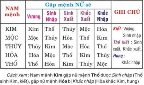 Thí dụ vợ Mệnh Thuỷ lấy chồng Mệnh Hoả thì xấu, nhưng chồng Mệnh Thuỷ lấy vợ Mệnh Hoả thì tốt. Vì Thuỷ khắc Hoả, nhưng Hoả không khắc Thuỷ mà Hoả lại khắc Kim. Các bạn lưu ý nhé!