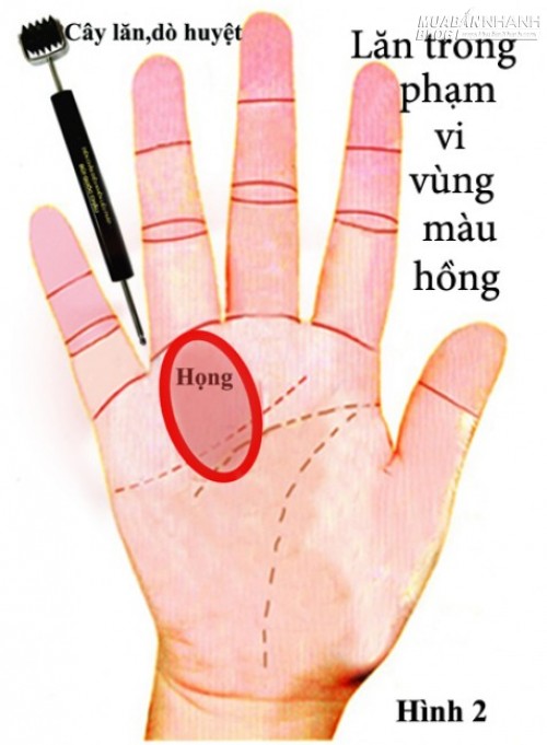 Ma sát vùng vòng tròn màu hồng (xem hình 2). Bạn có thể dùng cán muỗng càfé, hay cái chìa khóa xe của bạn cũng có thể cào vào chổ màu hồng cho đến khi đàm hết vướng víu và hết đau họng. Càng tác động vào vùng này nó sẽ làm thông cổ cho bạn.