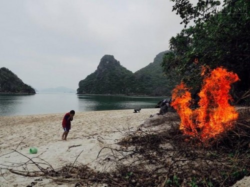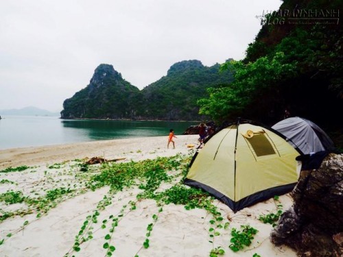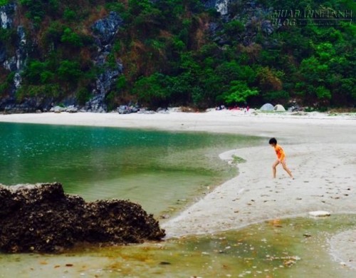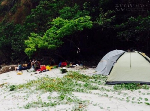 Sau hơn 30 phút đi bằng tàu cao tốc, gia đình tôi lọt vào một vụng nước hình trăng khuyết, với bãi cát dài chừng hơn 30 m khi chưa tới đỉnh triều, ba mặt là núi đá. Cả nhà reo lên sung sướng vì sự diễm lệ hoang vắng của hòn đảo. Anh chàng chủ tàu ái ngại, hỏi tôi đã suy nghĩ kỹ về quyết định cắm trại trên đảo chưa, vì nơi đây không có nước ngọt, sóng điện thoại, và có thể không an toàn. Lời đề nghị ấy lập tức bị gạt đi. Tàu vừa dừng lại, lũ trẻ đã hò nhau nhảy xuống đảo, chia nhau tìm chỗ hạ trại. |