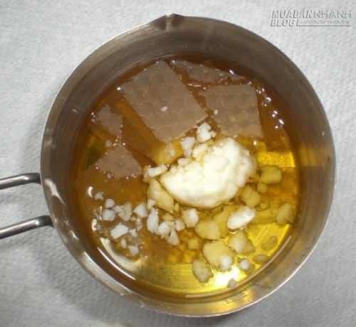 Bước 1: Cho phần dầu ô liu vào nồi nấu trên bếp lửa nhỏ rồi cho phần sáp ong vào đun sôi chừng 10 phút. Lúc này cả dầu ô liu và sáp ong sẽ tan ra đều.![]()