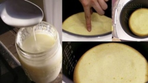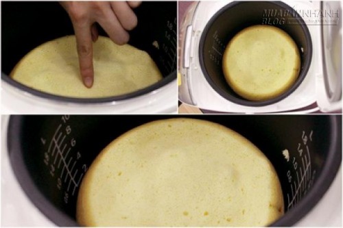 – Lót dưới đáy nồi cơm điện một lớp giấy nướng hoặc một lớp bơ. Sau đó đổ hỗn hợp bột vào nồi, bật chế độ cooking. Nấu đến khi nồi chuyển sang chế độ warm, để thêm khoảng 20 phút. Để kiểm tra bánh chín hay chưa nên dùng tăm xiên qua bánh, nếu tăm ướt, bật chế độ cooking thêm lần nữa và tiếp tục nấu. Khi nào thấy bánh nở xốp là xong!