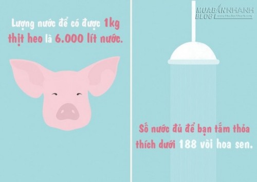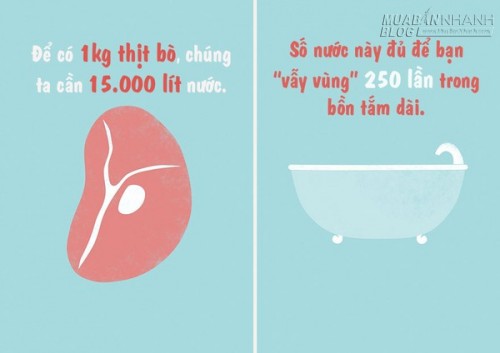 Nhưng sự thật là, bạn còn tiêu tốn nhiều hơn thế nữa. Bạn có biết, để có được 1 kg thịt bò, bạn cần đến 15.000 lít nước? Bởi lẽ một con bò nuôi suốt ba năm mới cho 200 kg thịt; trong thời gian này chúng ta tiêu tốn 1.300 kg hạt ngũ cốc, 7.200 kg cỏ, 24 mét khối nước cho việc ăn uống và 7 mét khối nước nữa cho việc vệ sinh chuồng trại.