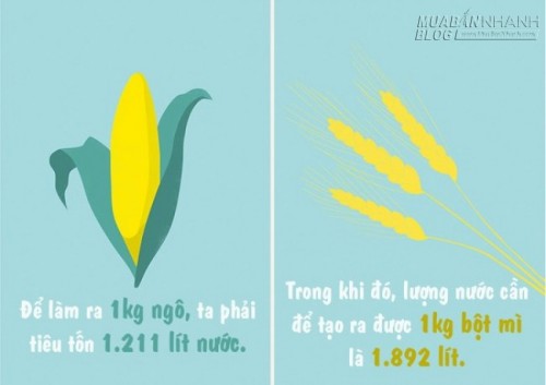 Cùng với đó, trong các loại ngũ cốc chính của thế giới thì lượng nước dùng để sản xuất lúa gạo là tốn nhất - mất đến 1.350 tỉ mét khối - chiếm 21% nguồn nước khả dụng. Lúa mì cần 790 tỉ mét khối nước, ngô (bắp) 550 tỉ mét khối, đậu nành 290 tỉ mét khối...