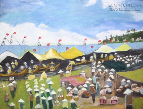 Bức tranh "Cảng cá Diêm Điền" mà cụ Thi vẽ lại trong một lần về thăm. Ảnh chụp lại. |