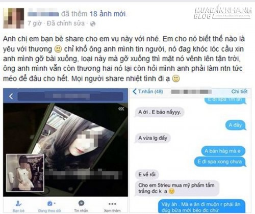 "Anh chị em bạn bè share cho em vụ này với nhé. Em cho nó biết thế nào là yêu với thương chỉ khổ ông anh mình tin người, nó đag khóc lóc cầu xin anh mình gỡ bài xuống, loại này mà gỡ xuống thì mặt nó vênh lên tận trời, ông anh mình vẫn còn thương hai nó lại còn hỏi mình anh phải làm ntn tức méo để đâu cho hết. Mọi người share nhiệt tình đi ạ".