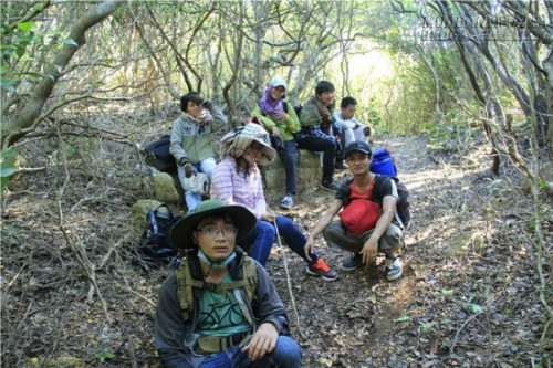 Đoàn chúng tôi không đi theo các đoàn khác là đi men ghềnh đá, chúng tôi chọn hướng rừng, qua nhiều lùm cây, hốc đá, rừng cây lá khô để đi.