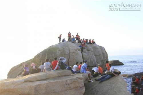 Hành trình kết thúc với việc ngao du trên thuyền câu. Đây là một trải nghiệm rất thú vị, chúng tôi phải ngồi trong chiếc mủng tròn chênh vênh, lắc lư vi vu trên dòng biển Đông xanh ngắt mới đến được nơi chiếc thuyền câu neo đậu. Giá thuyền từ Bãi Rạng về khu vực cửa biển nhà chú Hai là 1.300.00 đồng cho 10 người. Trước đó cả đoàn vẫn phải nhảy ghềnh đá, chui qua những khe hốc của những tảng đá khổng lồ trước biển, băng qua núi, luồn qua những rặng cây rừng để về lại Bãi Rạng.